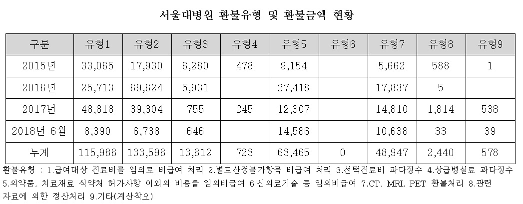 심평원은 2015~2018년 6월까지 서울대병원을 대상으로 1094건의 진료비 확인청구 접수를 받았고 그 중 388건에 대해 환불 결정했다.