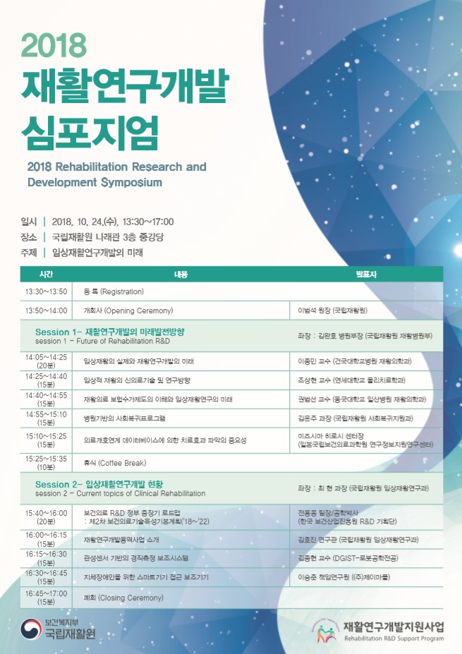 장애인, 노인 등 사회적 약자들의 삶의 질 향상을 위해 마련된 이번 심포지엄에서는 △임상재활의 실제와 재활연구개발의 방향 △병원기반의 사회복귀 프로그램과 의료개호연계 데이터베이스에 의한 치료효과의 중요성 △보건의료 R&D 정부 중장기 로드맵 △재활연구개발지원사업의 방향 및 소개와 연구 성과 결과 등이 발표돼 첨단 재활의료기술을 응용한 4차 산업혁명에 맞춰 그간의 임상재활연구 성과를 공유하고 그 발전방향을 제시했다.