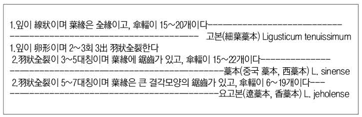 1) 자연 상태에서 마지막 끝의 잎(末回葉片) 모양의 線모양(고본-細葉藁本), 卵形(藁本 혹은 遼藁本)으로 1차 구분이 가능하고, 葉緣의 鋸齒 심도(보통-藁本, 큰 결각-遼藁本)로 2차 구분이 가능하다.