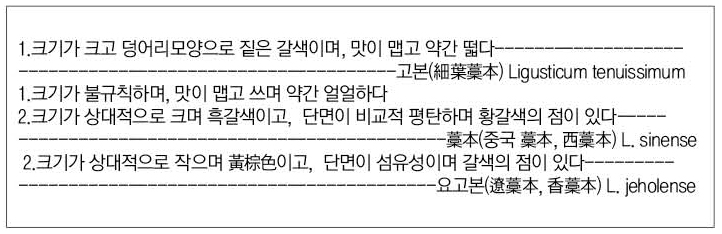 2) 약재 상태에서 표면의 색깔(짙은 갈색: 고본-細葉藁本, 흑갈색: 藁本, 黃棕色: 遼藁本)로 1차 구분이 가능하고, 단면의 형태 및 점색깔(평탄하며 황갈색 점: 藁本, 섬유성이며 갈색의 점: 遼藁本)로 2차 구분이 가능하다.
