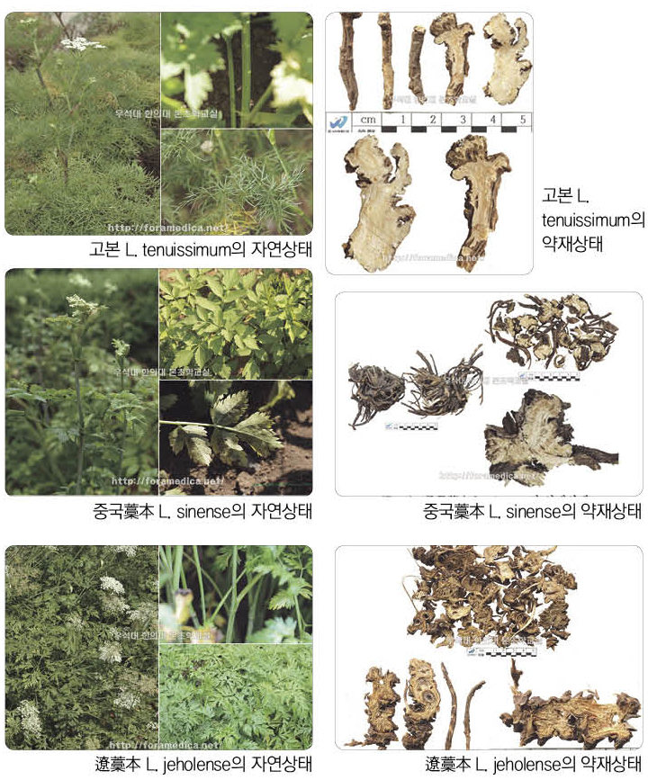 기본적으로 3종 모두 기원식물에 해당되기 때문에 약효는 대동소이하다고 전제할 수 있다. 하지만 구체적인 내용에서의 차이점을 살펴보면 다음과 같다. 특히 우리나라의 경우 고본(細葉藁本) Ligusticum tenuissimum이 자생 혹은 재배가능하다는 점에 집중할 필요가 있겠다.