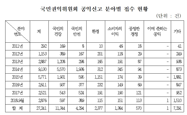 국회 김정훈 의원실에서 국민권익위원회에 자료요청을 통해 받은 답변자료인 '2011∼2018년 9월까지 국민권익위에 신고된 공익신고 및 보상금 지급 내역'을 살펴보면, 총 신청된 건수는 2만7241건인 것으로 조사됐다.
