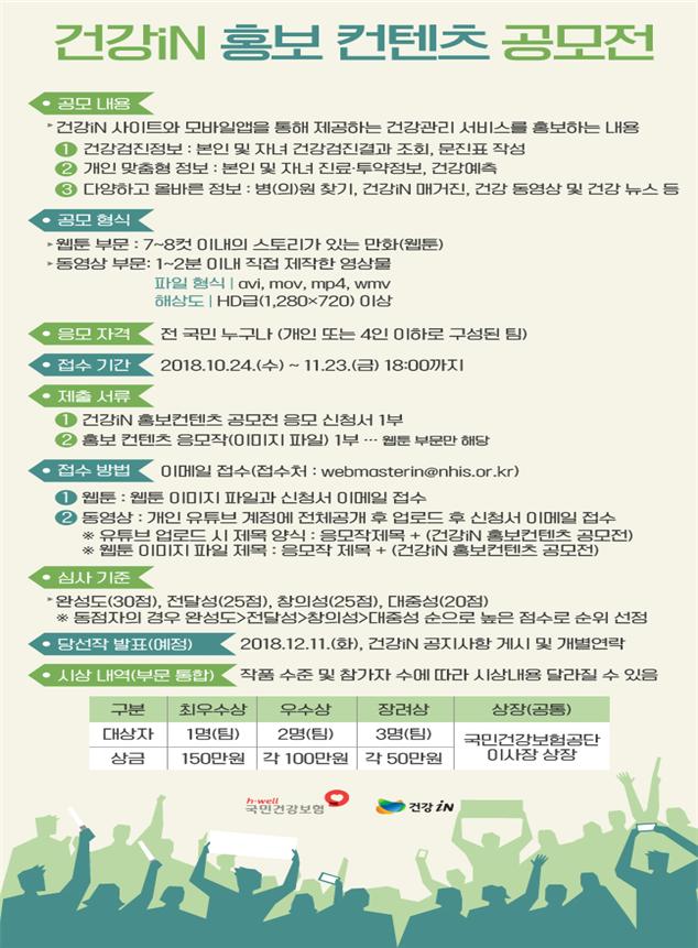 공모내용은 건강iN 사이트와 모바일앱을 통해서 제공하는 건강관리 서비스인 △건강검진 정보 제공(건강검진결과조회 및 문진표 작성) △개인맞춤형 정보 제공(진료 및 투약정보, 건강예측) △다양하고 올바른 건강정보 제공(병원찾기, 건강iN 매거진, 건강 뉴스 등)을 홍보하는 내용을 포함한 홍보 컨텐츠로, 개인 또는 4인 이하로 구성된 팀의 형태로 누구나 참여 가능하다.