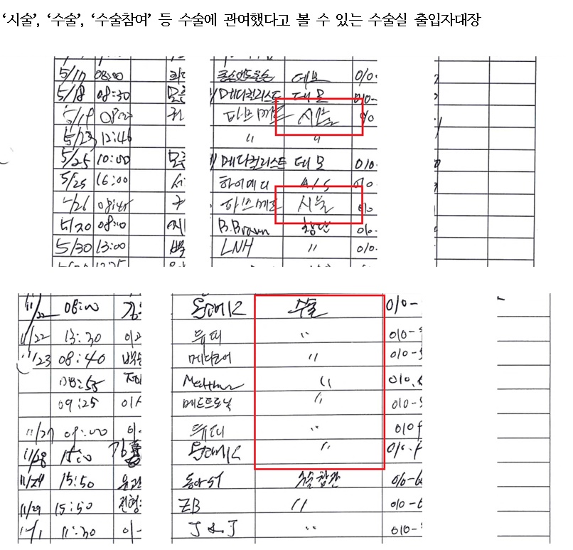 최 의원에 따르면 출입자대장에는 '시술', '수술', '수술 참여', 'OP' 등 외부인이 수술에 참여했다고 의심할 만한 기록이 총 45번이나 기록돼 있어, 이에 대한 추가적인 조사가 필요하다는 지적이다.