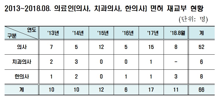 연도별로 살펴보면 △2013년 10명 △2014년 10명 △2015년 12명 △2016년 6명이었으며, 지난해 17명으로 급증했고, 지난 8월 현재 11명이 의료인 면허를 재교부받은 상황이다.