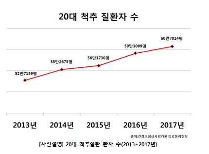 20대 척추질환 환자는 지난 2013년 52만7159명에서 2017년 60만7014명으로 7만9855명 증가, 최근 5년 동안 약 15% 증가했다. 척추질환 환자 중 가장 많은 비중을 차지하는 50대의 경우 지난해 193만4701명으로 같은 기간 증가율은 8% 수준인 것으로 나타나, 증가율 수준은 20대의 절반 수준에 불과했다.