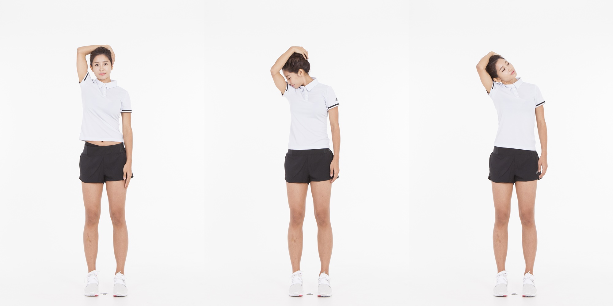 목 쭉쭉 늘리기 스트레칭은 먼저 등을 곧게 펴고 선채로 한 손을 머리 옆에 댄다. 손으로 머리를 어깨 앞쪽 45도 방향으로 당기고 15초 정도 유지한 뒤 천천히 돌아온다. 다음에는 머리를 어깨 뒤쪽 45도 방향으로 당겨 15초 유지한 뒤 풀어준다. 좌우로 각 5회씩 1세트로, 3세트 반복한다. 이때 어깨가 올라가거나 등이 구부정해지지 않도록 주의한다.