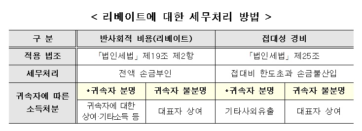 이에 따라 국세청은 대법원 판례에 따라 리베이트를 접대비로 인정하지 말고 리베이트 수령자에 대하여 소득처분을 했어야 한다는 지적이다.