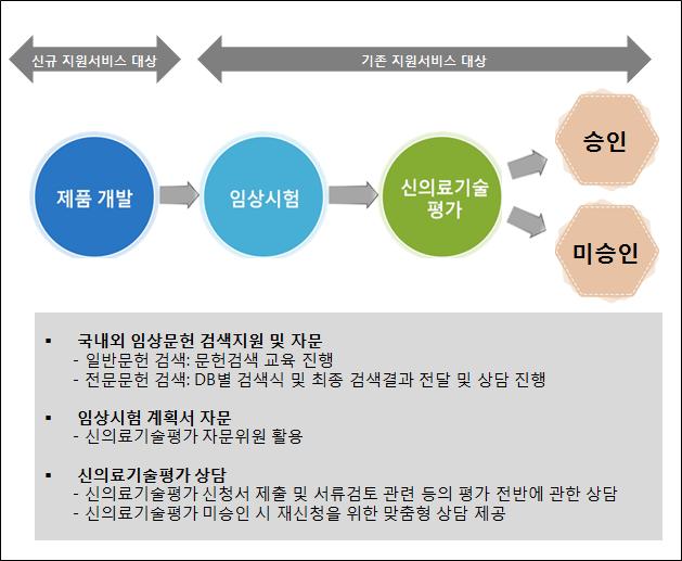 이를 위해 의료기술 개발시부터 필요한 국내외 임상문헌 검색과 자문 서비스를 제공하고, 신의료기술 본 평가 수준의 문헌고찰 등 전 과정의 사전 검토 활동을 수행하는 컨설팅을 진행한다.