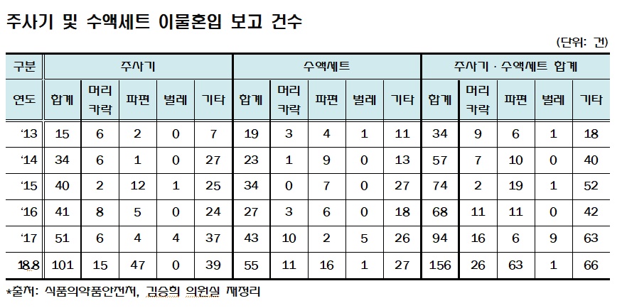 유형별로 살펴보면 주사기는 '파편'이 47건으로 가장 많았고, 머리카락(15건), 기타(이물질, 39건) 순이었고, 수액세트의 경우에는 기타(이물질·27건), 파편(16건), 머리카락(11건), 벌레(1건) 등의 순이었다.