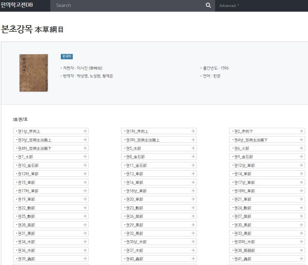 이번에 공개된 본초강목의 원문과 번역문은 동아시아 전통의학의 주요 의서들을 온라인에서 열람하고 검색할 수 있는 온라인 웹서비스인 '한의학고전DB'(https://mediclassics.kr/)를 통해 누구나 열람할 수 있다.