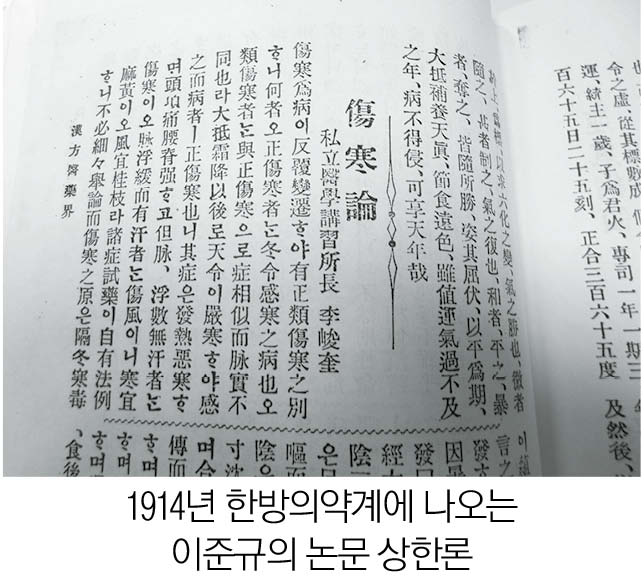 그는 1914년 1월 한국 최초의 한의학학술잡지인 『漢方醫藥界』 제2호에 「傷寒論」이라는 제목의 글을 싣는다. 내용은 아래와 같다. (필자의 번역)