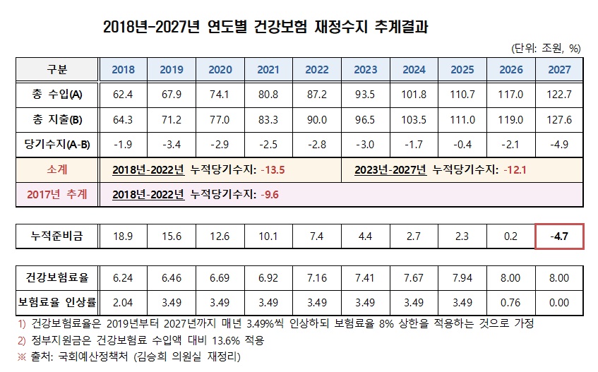 국회예산정책처 추계자료에 따르면 당장 올해부터 건강보험 재정지출이 재정수입보다 많아 1조9000억원 규모의 적자가 발생하고, 2027년까지 매년 최소 4000억원에서 최대 4조9000억원 규모의 적자가 발생하는 것으로 나타났다.특히 문재인 대통령 임기기간인 2022년까지 총 13조5000억원의 적자가 발생하는 것으로 나타났다. 이는 지난해 국회예산정책처가 김승희 의원실의 요청으로 추계를 진행했을 당시의 적자규모 9조6000억원보다 무려 3조9000억원이 증가한 것이다.