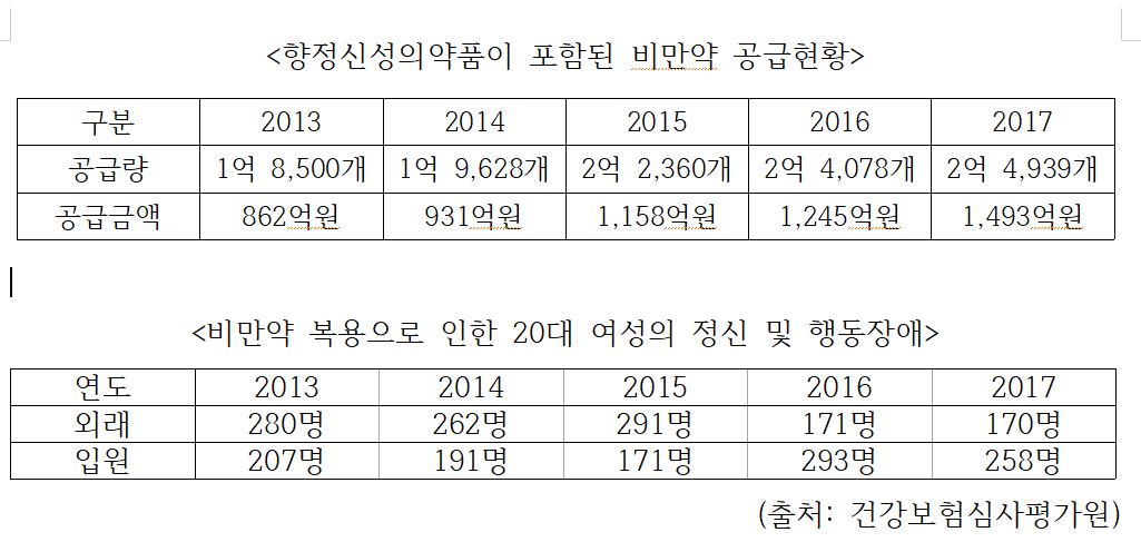 대표적 비만약인 펜터민의 경우 하루에 1정씩 4주를 복용하도록 하고 있는데, 2017년도 반출량 기준(2억 4939개)으로 살펴보면 890만명이 먹을 수 있는 양이다.
