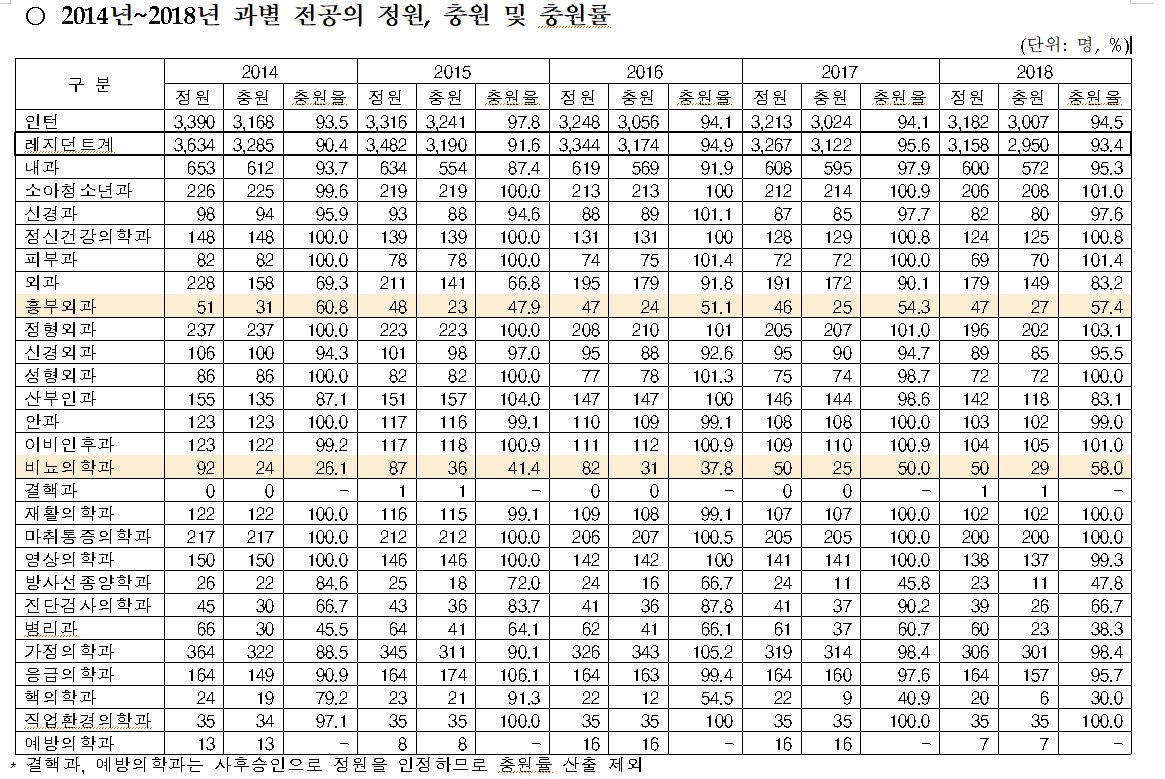 반면 개업이 손쉬운 소아청소년과, 정형외과, 정신건강의학과, 피부과, 성형외과, 이비인후과, 재활의학과의 경우 해마다 100%가 넘는 충원율을 보여 대조를 보였다.