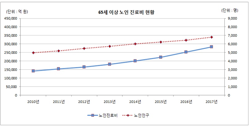 [한의신문=강환웅 기자] 국민건강보험공단과 건강보험심사평가원이 공동으로 '2017년 건강보험통계연보'를 발간한 가운데 지난해 65세 이상 노인진료비는 28조3247억원으로 전년대비 12.1% 증가했으며, 노인 1인당 연평균 진료비가 425만5000원으로 400만원대를 돌파하는 등 지난 2010년과 비교해 2.0배가 증가한 것으로 나타났다.