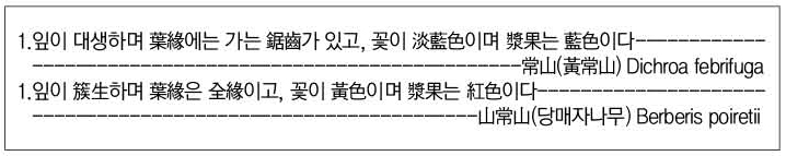 常山(黃常山) Dichroa febrifuga과 山常山(당매자나무) Berberis poiretii의 자연상태감별 검색표(discriminative key in natural status)를 제시하면 다음과 같다.