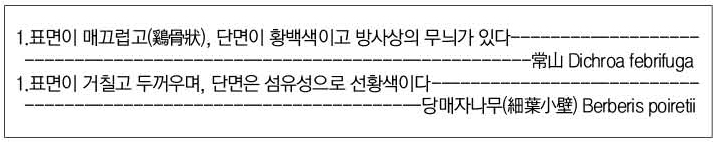 常山(黃常山) Dichroa febrifuga과 山常山(당매자나무) Berberis poiretii의 약재상태의 감별 검색표(discriminative key in Herbs)를 제시하면 다음과 같다.