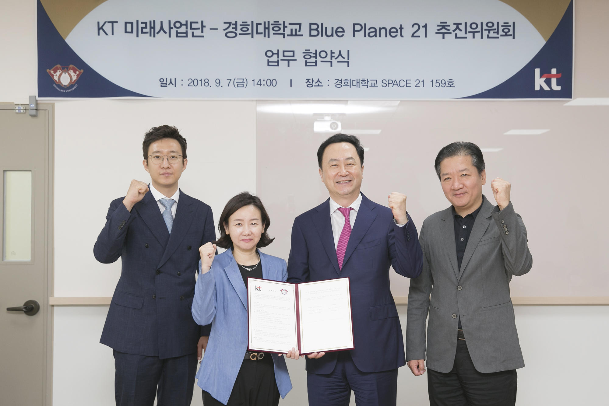 한편 이날 업무협약식에는 경희대학교 Blue Planet 21 준비위원회 정기택 위원장, 경희대학교 Blue Planet 21 준비위원회 김재홍 교수, KT 미래사업개발단 고윤전 단장, KT 미래사업개발단 이성형 팀장 등이 참석했다.