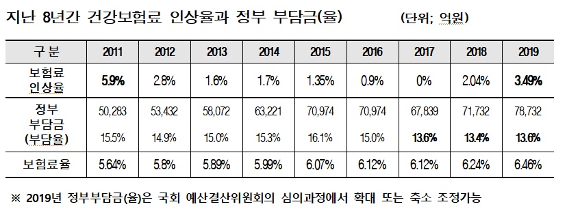 건보노조는 "이달 초 국회 예산결산위원회에 제출될 2019년도 건보재정 정부부담은 7조8732억원으로 내년도 건보료 예상수입액(57조8100억원)의 13.6%로 확인됐으며, 이는 건강보험법에서 규정한 정상적인 정부부담금 12조7193억원에서 4조8461억원, 즉 38%가 축소된 금액"이라며 "2019년 건보재정 정부부담금이 2017년에 이어 3년 연속 13%선에 그칠 것으로 예상돼 문제의 심각성을 더하고 있다"고 밝혔다.