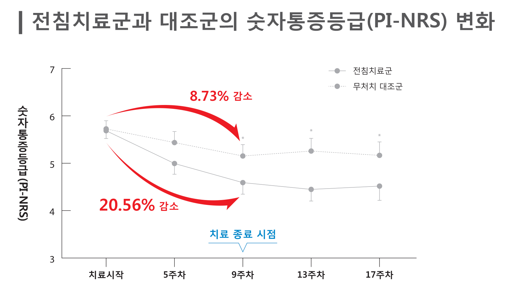 전침 치료시 통증 20.56% 감소한 반면 대조군은 8.73% 감소에 불과