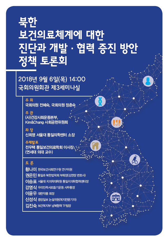 남북토론회더불어민주당 전혜숙 의원·정춘숙 의원이 주최하고, (사)건강사회운동본부와 Kim & Chang 사회공헌위원회가 주관하는 `북한 보건의료체계에 대한 진단과 개발·협력 증진 방안 정책토론회'가 6일(목) 오후 2시 국회의원회관 제3세미나실에서 개최된다.