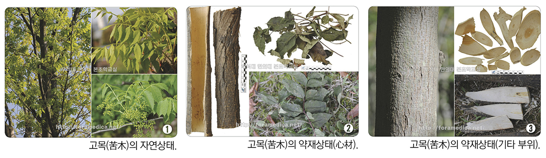 실제로 중국 한약시장에서는 가지와 잎을 苦木, 벗겨낸 木部를 苦樹皮로 유통하고 있다. 정리하자면 한국에서의 주된 약용 부위는 心材이지만, 중국에서의 주된 약용 부위는 가지와 잎 혹은 樹皮인 것이다.