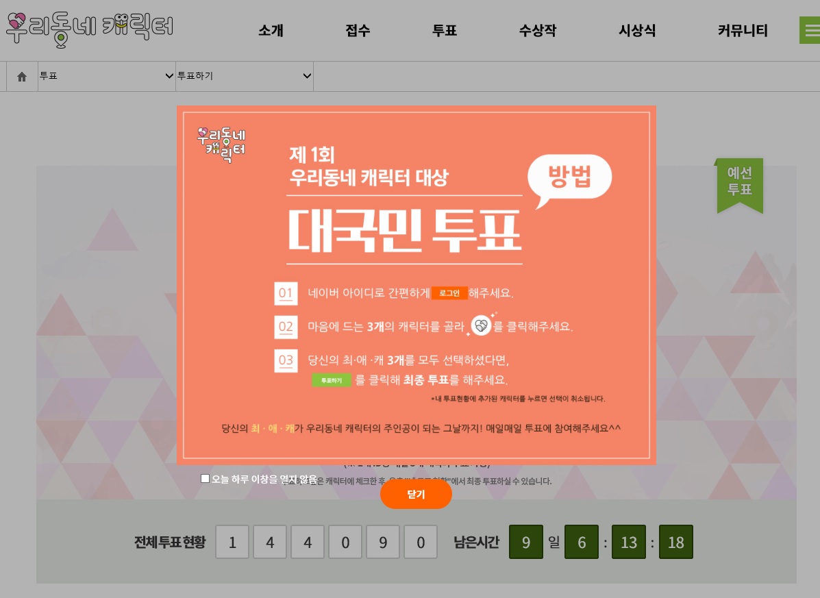 예선 투표는 ‘우리동네 캐릭터 홈페이지 (http://ourcharacter.kocca.kr)’에서 누구나 참여할 수 있으며 매일 3개 캐릭터에 투표 가능하다.