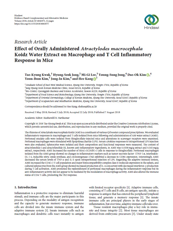 이번 연구논문(Effect of Orally Administered Atractylodes macrocephala Koidz Water Extract on Macrophage and T Cell Inflammatory Response in Mice)은 국제학술지 E-CAM(Evidence-Based Complementary and Alternative Medicine) 8월 최신호에 게재됐다.