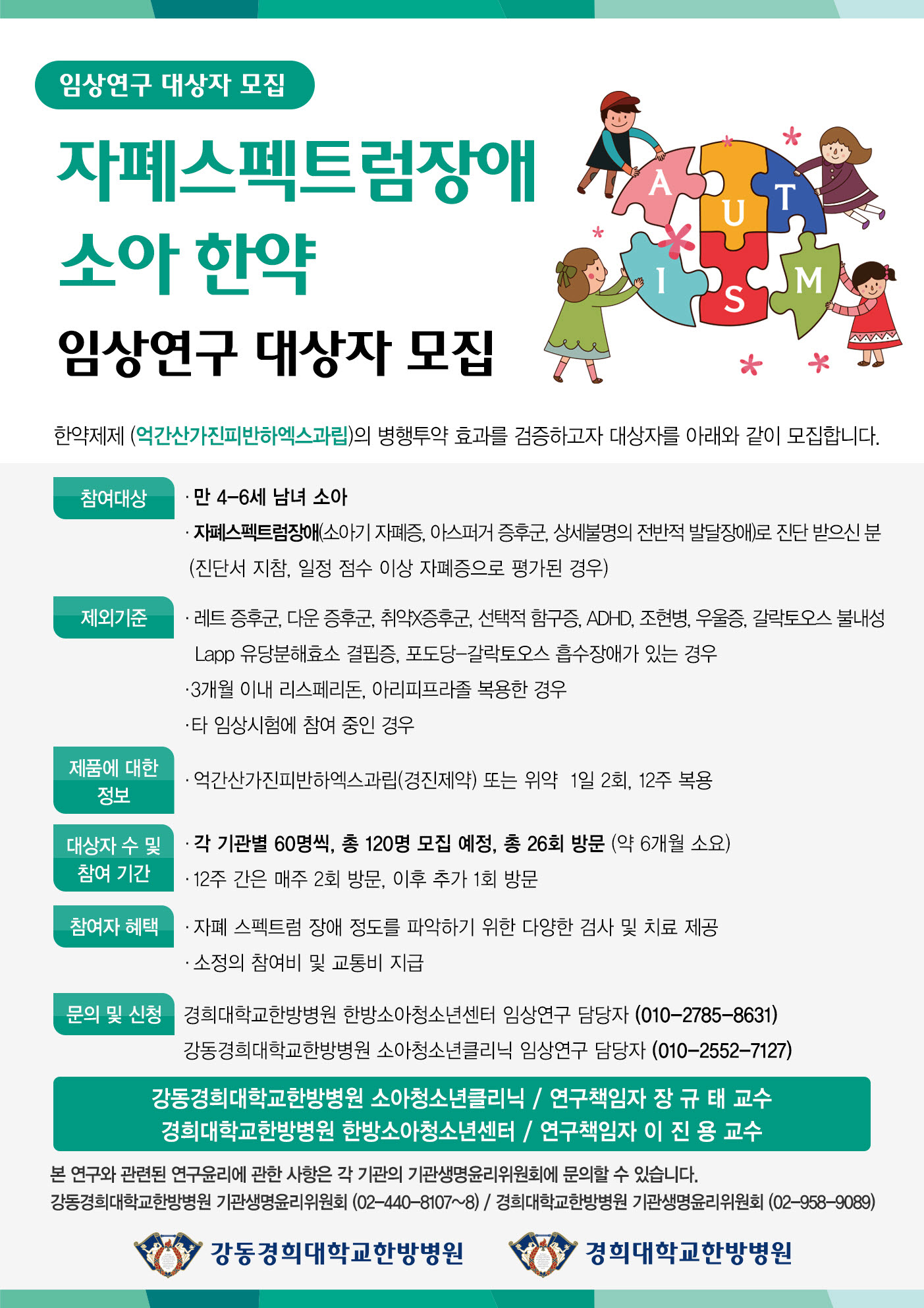 [한의신문=강환웅 기자] 강동경희대학교한방병원 한방소아청소년클리닉 장규태 교수팀은 자폐스펙트럼장애에 한약제제 '억간산가진피반하엑스과립'의 효과를 검증하기 위한 소아 대상자를 모집한다.