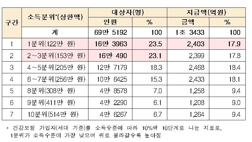 실제 적용 대상자의 약 47%가 소득분위 하위 30% 이하에 해당했으며, 지급액은 소득분위 하위 10%가 전체 지급액의 17.9%를 차지해 다른 소득분위별 지급액 비율(8.4∼10%)보다 약 2배 높은 것으로 나타났다.