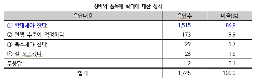 판매 품목 확대 필요 86.8% 및 부작용 경험 없다 93.5%로 나타나