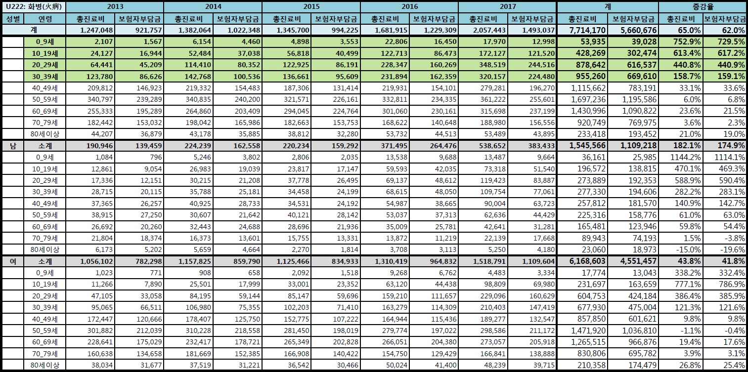 진료비 10세 이하 7.5배, 10대 6배, 20대 4.4배 증가