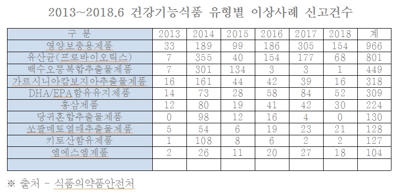 이 가운데 연도별로 이상사례가 가장 많이 신고된 제품은 첫 번째가 비타민과 같은 영양보충용제품이 966건이었고, 유산균(프로바이오틱스) 801건, 가르시니아캄보지아추출물 318건, DHA/EPA함유유지제품(오메가3) 309건, 홍삼제품 224건으로 뒤를 이었다.