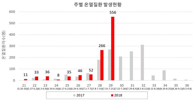 발생 시간대를 보면 온열질환자의 절반인 541건이 12시∼17시 사이에 발생했으며, 17시∼18시에도 101건이 발생하는 한편 지역별로는 경남(165명), 경기(125명), 경북(116명) 등의 순이었다.