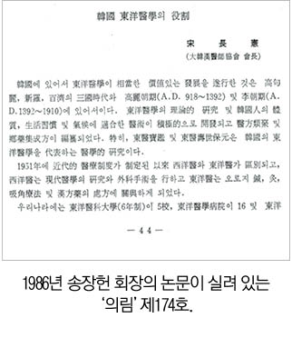 이 자리에서 한국측 대표 宋長憲 대한한의사협회장은 「韓國 東洋醫學의 役割」이라는 제목의 논문을 발표한다. 이 논문은 1986년 간행된 『醫林』 제174호에 요약전문이 게재돼 있다.