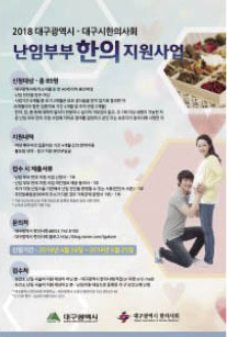 A. 대구시는 2011년부터 출산을 희망하는 난임부부에게 한의학적 치료를 통해 대상자의 가임력을 상승시켜 난임을 해결하고 출산율 향상에 기여하고자 대구시한의사회와 협력해 한의난임 지원사업을 지원해오고 있습니다. 최근 한의난임 지원사업을 추진하면서 사업 참여자를 대상으로 실시한 설문조사를 보면 70% 정도의 높은 만족도를 보이고 있고, 난임부부의 임신성공률도 효과를 나타내고 있어 향후 지속되어야 할 사업이라고 생각합니다.