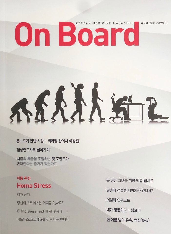 한의사 역시 환자의 많고 적음, 의료기관 운영과 직원 관리, 환자 치료 과정에서 크고 작은 스트레스에 시달릴 수 있다. 이번 On Board 제6호에서는 독자 스스로 스트레스 지수를 측정해 보고, 스트레스를 이겨낼 수 있도록 컬러링북, 카드뉴스 등을 비롯해 다양한 해소법을 소개한다.