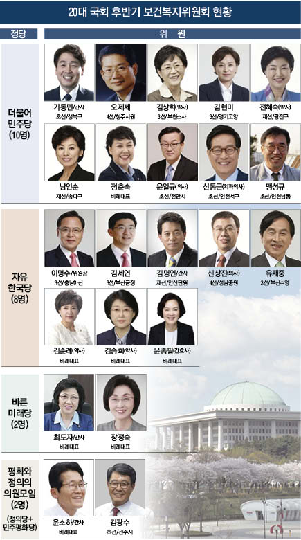 보건의약 분야 직능별로 살펴보면 약사는 총 4명(김상희, 전혜숙, 김순례, 김승희), 의사 2명(신상진, 윤일규), 치과의사 1명(신동근 의원), 간호사 1명(윤종필)이 복지위에 자리를 잡은 것으로 확인됐다.