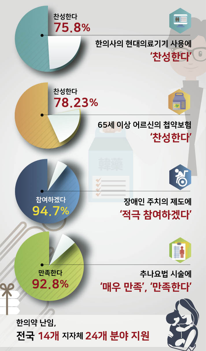 첩약 보험도 마찬가지다. 대한한의사협회가 지난해 11월 첩약 보험 시행의 당사자인 전체 한의사를 대상으로 65세 이상 어르신 가입자 또는 피부양자를 위한 첩약보험 추진 여부를 묻는 전 회원 투표를 진행한 바 있다. 78.23%라는 압도적인 찬성률을 보였다.