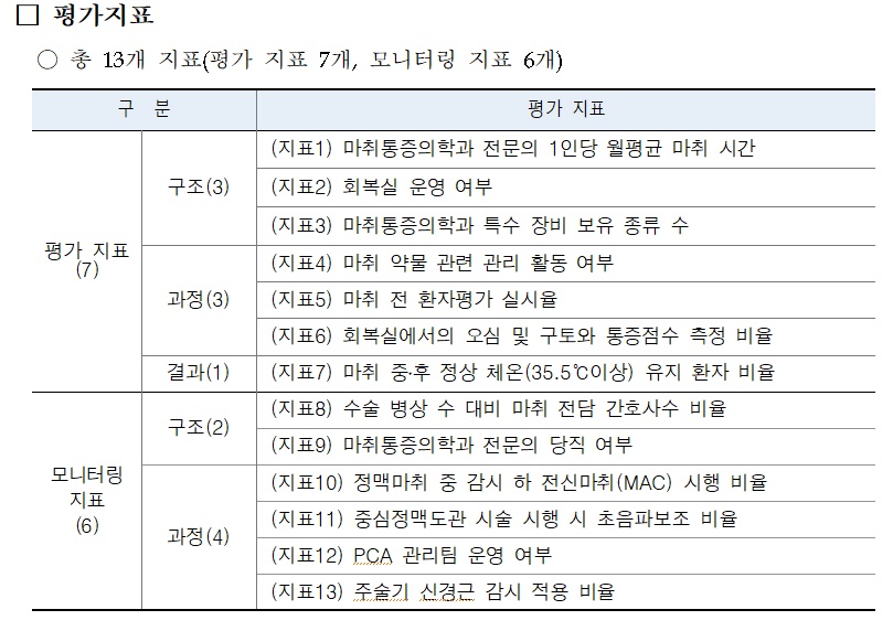 마취 적정성 평가 지표는 평가지표 7개·모니터링 지표 6개 등 총 13개로, △마취통증의학과 전문의 1인당 월평균 마취 시간 △회복실 운영 여부 △마취통증의학과 특수 장비 보유 종류 수 △마취 약물 관련 관리 활동 여부 △마취 전 환자평가 실시율 △회복실에서의 오심 및 구토와 통증점수 측정 비율 △마취 중·후 정상체온(35.5℃ 이상) 유지 환자 비율 등이다.