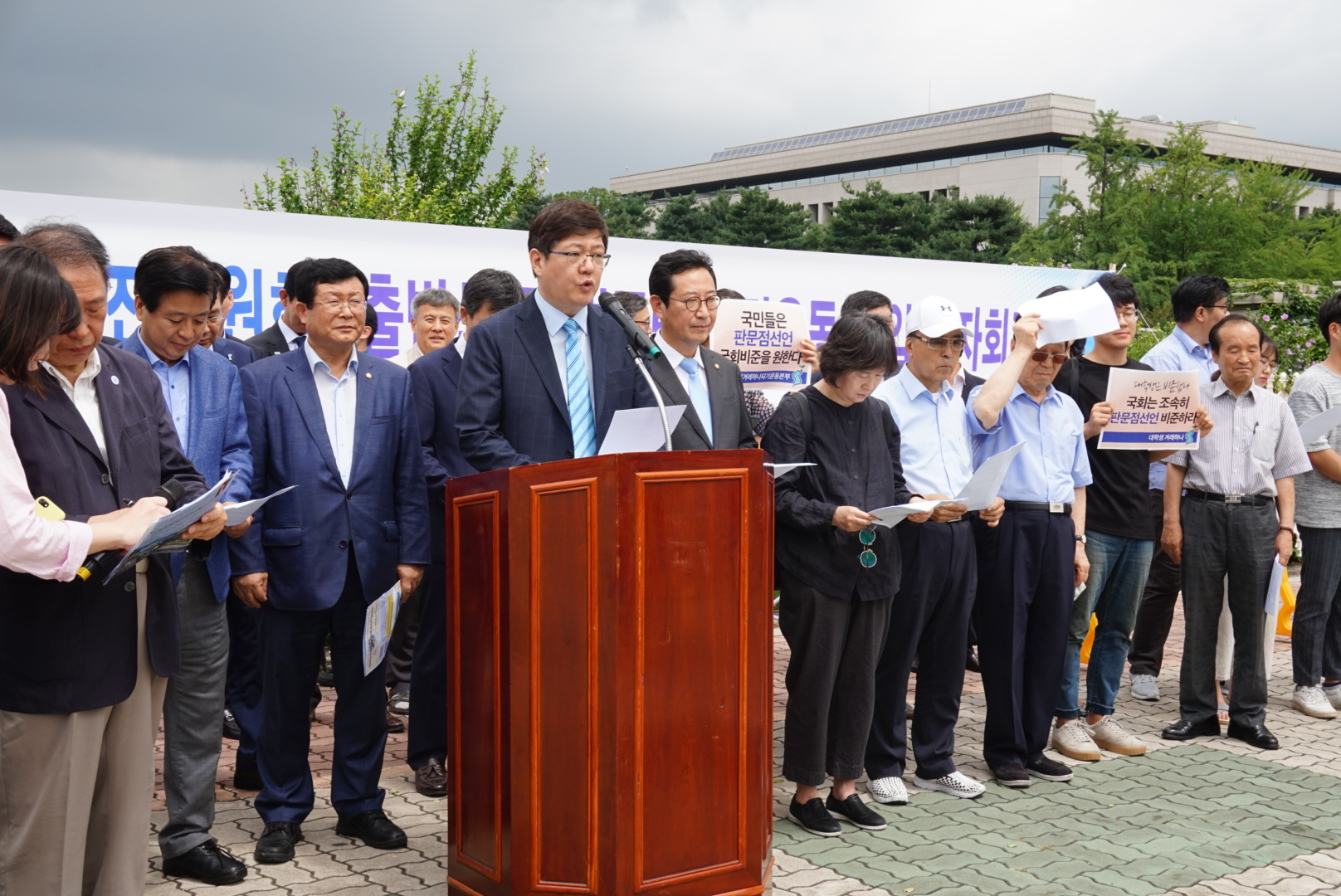 12일 국회 정문 앞에서 진행된 ‘4·27 판문점 선언 국회 비준 동의 촉구 추진위원회 출범식 및 범국민서명운동 돌입 기자회견’에서 김홍걸 민화협 상임의장이 기자회견문을 낭독하고 있다.
