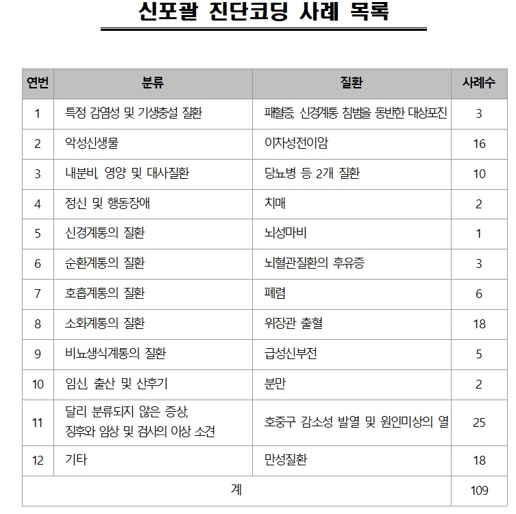 신포괄 진단코딩에 대한 요양기관의 이해를 돕기 위해 그동안 질병분류자문위원회에서 논의된 12개 분류의 109개 질환별 사례와 각각의 코딩 참고자료를 사례집에 수록했다.