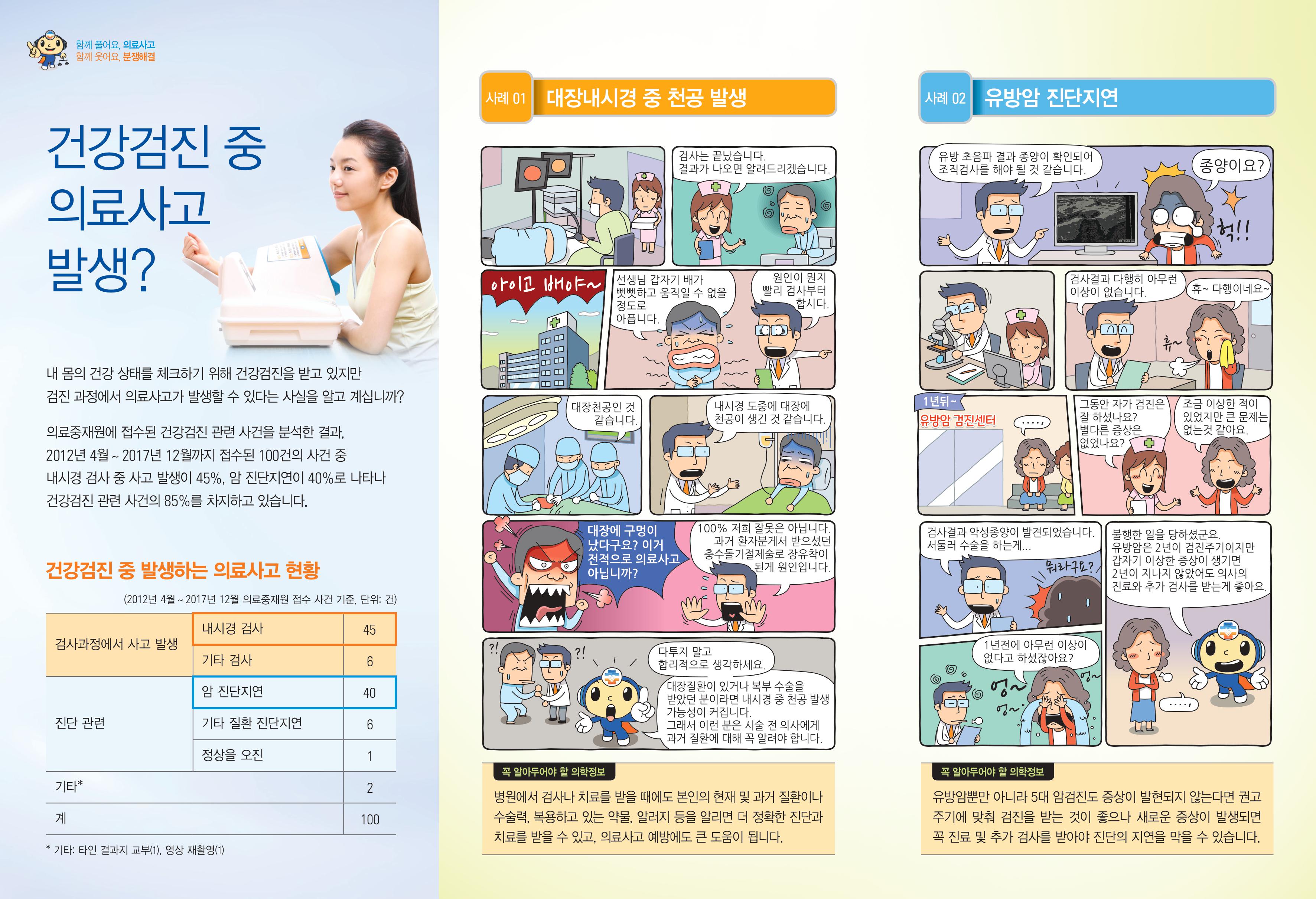 리플릿은 건강검진 중 발생 빈도가 높은 의료분쟁 사례와 예방 방법을 소개하는 내용을 담고 있다.