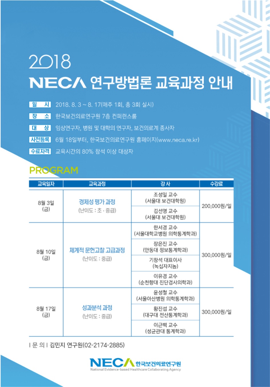 NECA는 보건의료분야 종사자 및 임상연구자, 대학(원)생 대상의 연구방법론 강좌를 해마다 개설해 보건의료계 연구역량 강화에 이바지하고 있다.