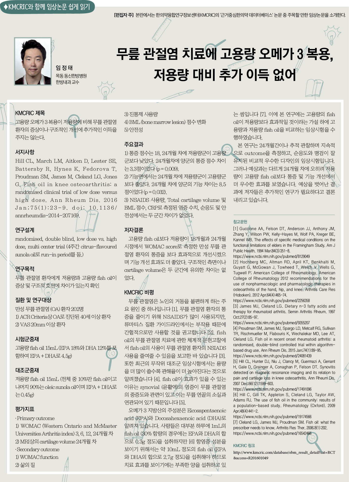 본 연구는 24개월간이나 추적 관찰하며 지속적으로 outcome을 측정하고, 순응도와 맹검이 잘 유지된 비교적 우수한 디자인의 임상시험입니다. 그러나 예상과는 다르게 24개월 차에 오히려 저용량이 고용량 fish oil보다 통증 및 기능 개선에서 더 우수한 효과를 보였습니다. 예상을 벗어난 결과에 저자들은 추가적인 연구가 필요하다고 결론 내리고 있습니다.