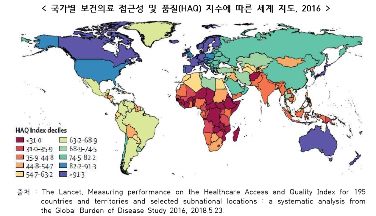 [한의신문=강환웅 기자] 생명공학정책연구센터는 지난 3일 발표한 'BioINwatch-세계 195개국 보건의료 접근성 및 품질 평가'를 통해 최근 'Lancet'지에 게재된 '세계 195개 국가 및 지역의 보건의료 접근성 및 품질에 관한 연구' 결과를 소개했다.