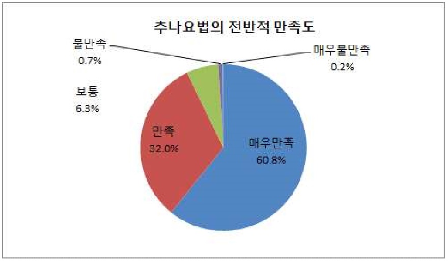 건강보험심사평가원이 지난 3일 공개한 '추나요법 급여 전환을 위한 시범사업 평가 연구' 결과 중 시범사업기관에서 건강보험 급여로 추나요법 진료를 3회 이상 받은 성인 근골격계 질환자 416명을 대상으로 한 환자 만족도 조사를 시행한 결과 추나요법의 전반적 만족도를 묻는 질문에 '매우 만족' 및 '만족'이 92.8%로 나타나 높은 만족도를 보인 반면 불만족한 경우는 0.9%에 불과했다.