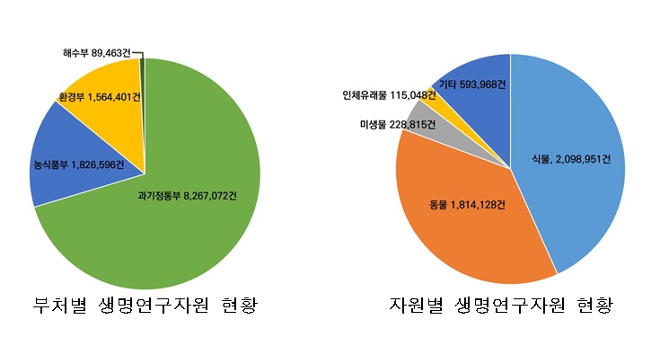 그동안 정부의 적극적인 투자를 통해 '17년 말 기준 총 1175만7532건의 국가생명연구자원을 확보했으며, 부처별로는 과기정통부(생명연구자원)가 826만7072건, 농림축산식품부(농업 생명자원) 182만6596건, 환경부(생물다양성 및 야생생물자원) 156만4401건, 해양수산부(해양수산생명자원) 8만9463건으로 나타나는 한편 자원별로는 식물 209만8951건, 동물 181만4128건, 미생물 22만8815건, 인체유래물 11만5048건으로 분석됐다.