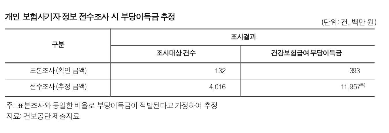 이와 관련 감사원이 감사기간 중 금감원이 보유하고 있는 2014년 1월부터 2017년 7월까지의 개인 보험사기자 정보 4016건을 건보공단에 제공해 이중 132건에 대해 건강보험급여 부당 지급 여부를 표본조사토록 한 결과 총 49건(37.1%)에 대해 3억9300만원이 부당하게 지급된 것으로 확인됐다. 이를 근거로 조사대상을 전체 4016건으로 확대할 경우 119억여원에 이르는 건강보험급여 부당이득금을 환수할 수 있을 것으로 추정되고 있다.